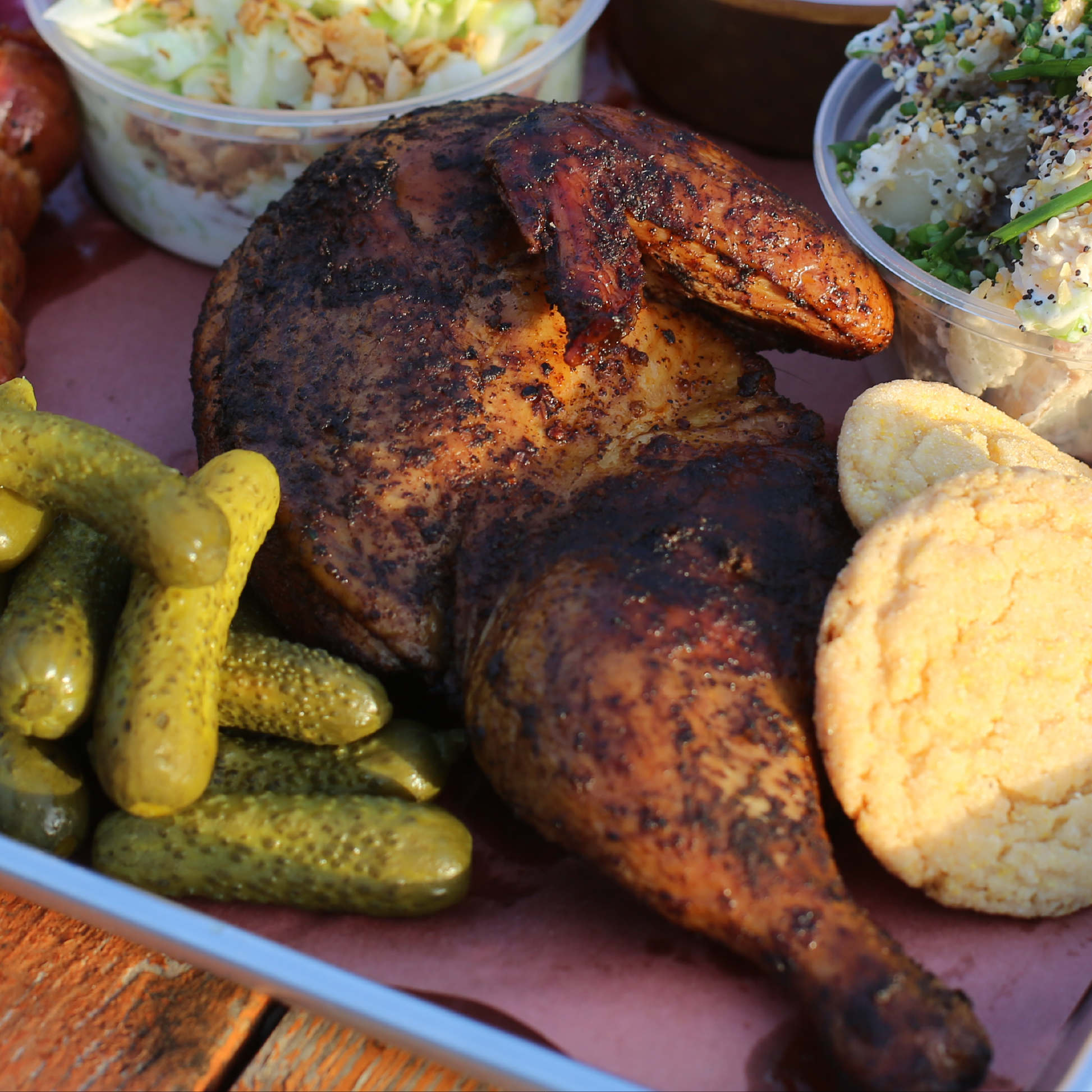 It’s no easy task to stand out next to our beef and pork—but these chickens really do fly. We take Rocky’s organic birds, trim them just right, season ’em up, and smoke them low and slow until the skin is rendered and the meat is fall-off-the-bone juicy. Tender, smoky, and loaded with flavor. If you’ve got leftovers (doubt it), they make a next-level chicken salad. We’ll even give you our special recipe.