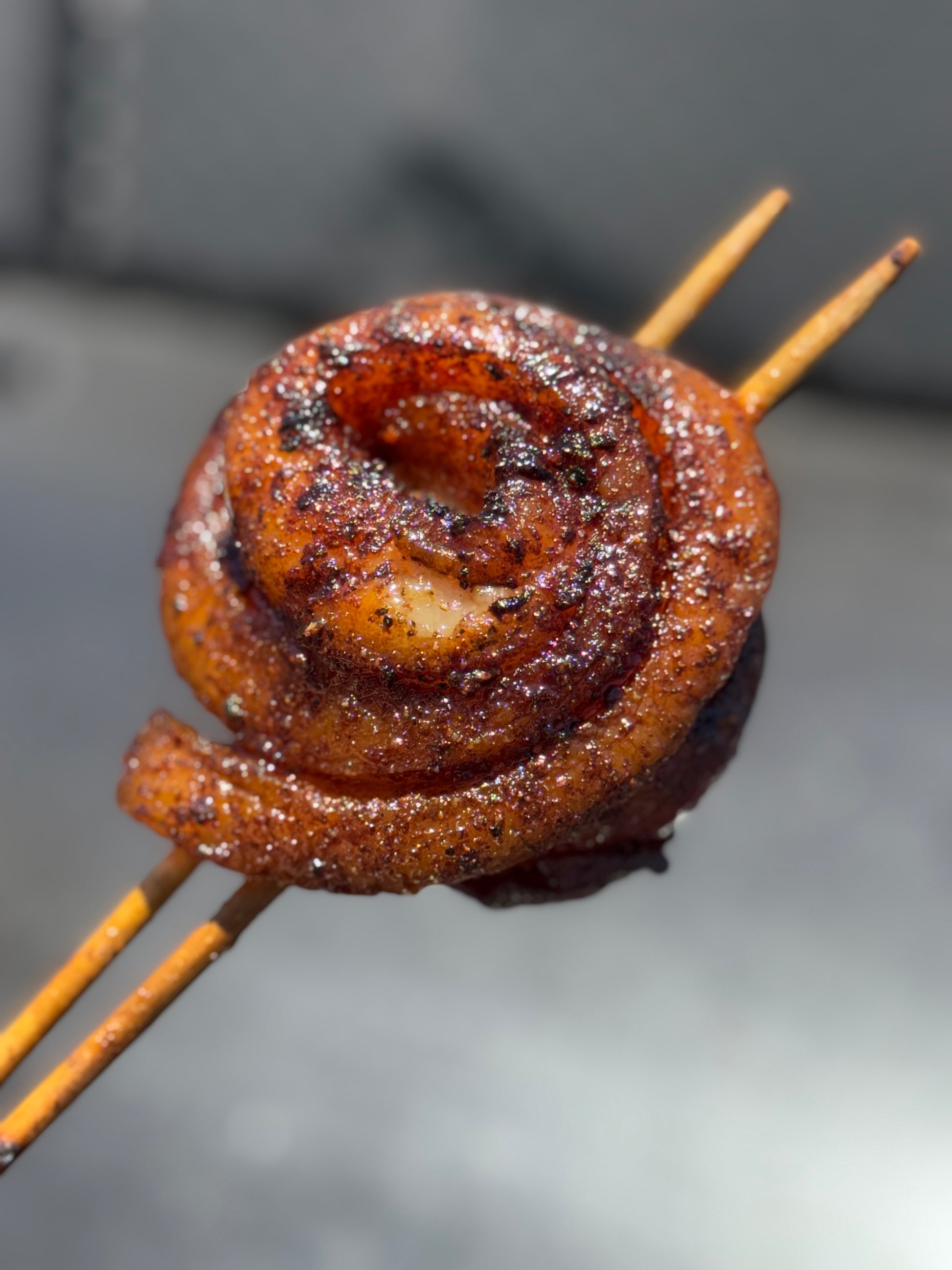 An extra-thick baton of heritage-bred Duroc pork belly—juicy, rich, and rendered to perfection. Seasoned with our signature Red Eye rub, kissed with a splash of Red Eye syrup, and finished with a dusting of organic wildflower honey powder… like a piece of French toast, but meatier, smokier, and way more dangerous. This one’s a treat. Don’t say we didn’t warn you.